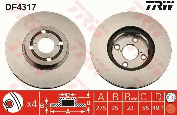 Диск гальмівний передн Лів/Прав TOYOTA COROLLA 1.4D/1.8/2.0D 01.01-10.07 TRW DF4317
